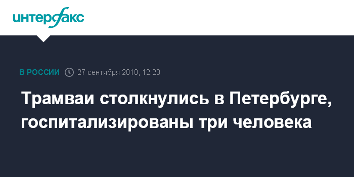 Санкт-Петербург. 27 сентября. INTERFAX.RU - В Петербурге в понедельник днем столкнулись два трамвая, сообщили "Интерфаксу" в Главном управлении МЧС по северной столице.