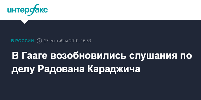 Вашингтон. 27 сентября. INTERFAX.RU - Судебный процесс над бывшим лидером боснийских сербов Радованом Караджичем возобновился в понедельник в Гааге в Международном трибунале по бывшей Югославии (МТБЮ), сообщает американская телекомпания Си-Эн-Эн.