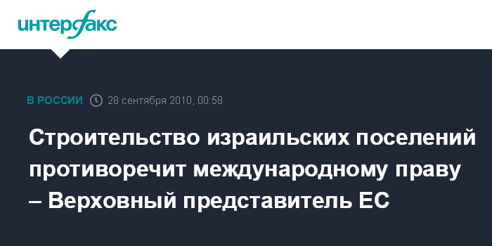 Брюссель. 28 сентября. ИНТЕРФАКС - Верховный представитель ЕС по внешней политике и политике безопасности Кэтрин Эштон распространила в понедельник в Брюсселе заявление, в котором выражает сожаление о решении Израиля не продлевать мораторий на строительство еврейских поселений на оккупированных арабских территориях.