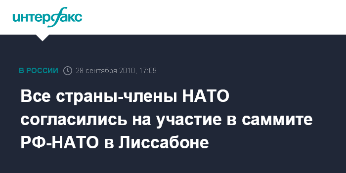 Брюссель. 28 сентября. INTERFAX.RU - Все 28 стран, входящих в Североатлантический альянс, дали согласие на участие в заседании Совета Россия-НАТО на высшем уровне в Лиссабоне 20 ноября, заявил во вторник в Брюсселе официальный представитель Североатлантического альянса Джеймс Аппатурай.