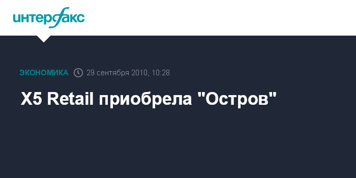 Москва. 29 сентября. INTERFAX.RU - X5 Retail Group N.V. закрыла сделку по приобретению 100% акций ЗАО "Остров-Инвест", управляющего магазинами под брендом "Остров" в Москве и Московской области.