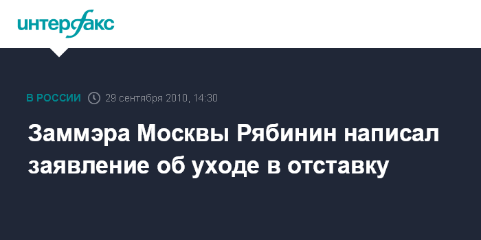 Москва. 29 сентября. INTERFAX.RU - Просьба об отставке заместителя мэра Москвы Александра Рябинина удовлетворена, сообщил врио мэра Москвы Владимир Ресин.