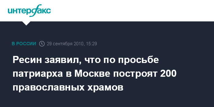 Ресин заявил, что по просьбе патриарха в Москве построят 200 православных храмов