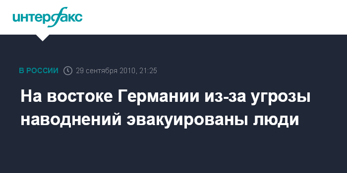 Берлин. 29 сентября. INTERFAX.RU - Эвакуация 2,5 тыс. челвоек проведена на востоке Германии из-за угрозы наводнений, сообщает в среду веб-сайт немецкого журнала Spiegel.
