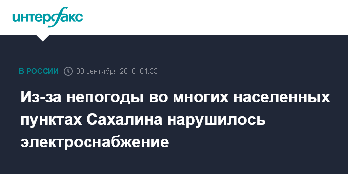 Южно-Сахалинск. 30 сентября. ИНТЕРФАКС-ДАЛЬНИЙ ВОСТОК - Циклон, который почти трое суток оказывал влияние на Сахалин, нарушил электроснабжение ряда населенных пунктов острова.