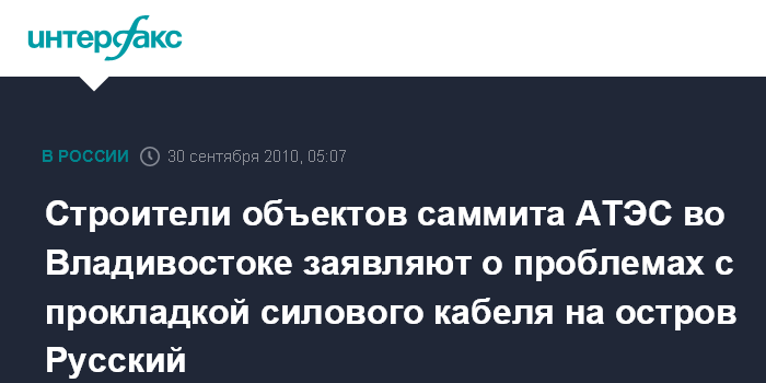 Владивосток. 30 сентября. ИНТЕРФАКС-ДАЛЬНИЙ ВОСТОК - ФГУ "Дальневосточная дирекция Министерства регионального развития РФ" заявляет о проблемах, которые у него возникли с другими госведомствами при попытке проложить силовой кабель на остров Русский для энергоснабжения будущих объектов саммита АТЭС.