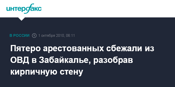 Чита. 1 октября. ИНТЕРФАКС-СИБИРЬ - Пятеро арестованных сбежали в четверг вечером из изолятора временного содержания ОВД Чернышевского района Забайкальского края, сообщил агентству "Интерфакс-Сибирь" руководитель пресс-службы УВД по Забайкальскому краю Евгений Жеребцов.
