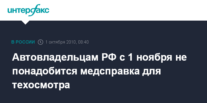 1 октября. INTERFAX.RU - Автомобилистам через месяц, как ожидается, не нужно будет предъявлять медицинскую справку при прохождении государственного технического осмотра транспортного средства.
