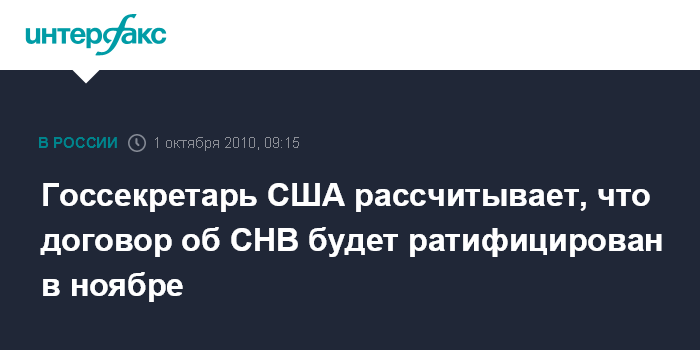 Вашингтон. 1 октября. INTERFAX.RU - Госсекретарь США Хиллари Клинтон выразила надежду на то, что российско-американский договор об СНВ будет ратифицирован после выборов в сенат в ноябре.