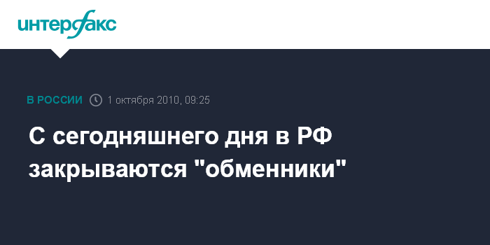 Москва. 1 октября. INTERFAX.RU - С сегодняшнего дня вступает в силу указание Банка России, согласно которому обменные пункты, открытые кредитными организациями (филиалами кредитных организаций) ранее, с 1 октября должны быть переведены в статус внутренних структурных подразделений либо закрыты.