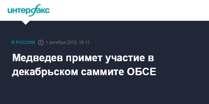 Москва. 1 октября. INTERFAX.RU - Президент РФ Дмитрий Медведев примет участие в саммите ОБСЕ 1-2 декабря в Астане.