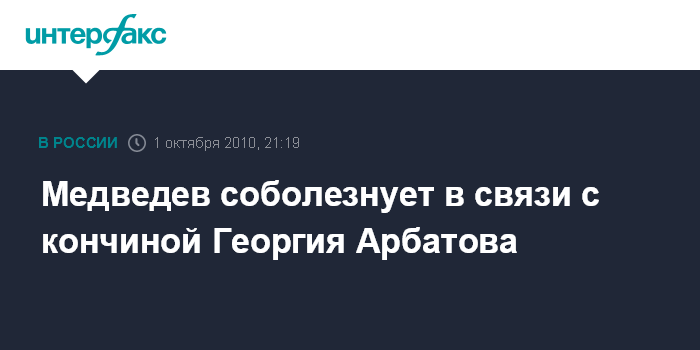 Москва. 1 октября. INTERFAX.RU- Президент России Дмитрий Медведев выразил соболезнования родным и близким академика Георгия Арбатова в связи с его кончиной, сообщила пресс-служба Кремля в пятницу.