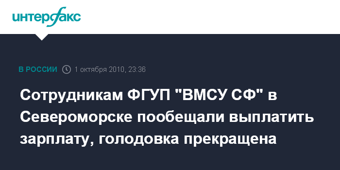 Москва. 1 октября. ИНТЕРФАКС - Работники ФГУП "Военно-морское строительное управление Северного флота", требовавшие выплатить им долги по заработной плате, прекратили голодовку, сообщает Управление пресс-службы и информации Министерства обороны РФ в пятницу.
