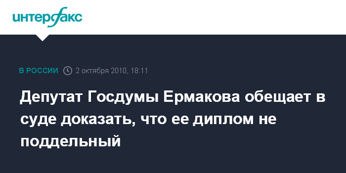 Москва. 2 октября. INTERFAX.RU - Депутат Госдумы РФ Наталья Ермакова, исключенная из партии "Единая Россия" за подделку диплома, заявляет о подлинности этого документа. "Я действительно закончила заочное отделение Новосибирской Академии, о чем свидетельствуют все необходимые документы, диплом и зачетная книжка", - сказала Н.Ермакова в субботу в эфире радиостанции "Эхо Москвы".