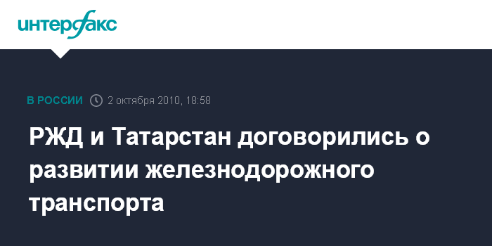 Казань. 2 октября. INTERFAX.RU - ОАО "Российские железные дороги" (РЖД) и Татарстан в субботу заключили соглашение о взаимодействии и сотрудничестве в области железнодорожного транспорта на 2011-2013 годы. Документ подписали президент республики Рустам Минниханов и президент РЖД Владимир Якунин, передал корреспондент агентства "Интерфакс-Поволжье", присутствовавший на мероприятии. Соглашение подразумевает взаимодействие сторон, в том числе при реализации мероприятий по подготовке к Универсиаде 2013 года в Казани, включая развитие инфраструктуры железнодорожного транспорта с учетом обслуживания гостей и участников Игр.