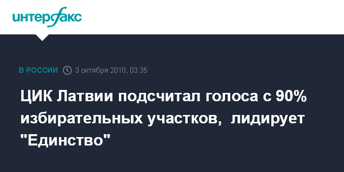 Рига. 3 октября. ИНТЕРФАКС/BNS - По предварительным обобщенным данным ЦИК Латвии на состоявшихся в субботу выборов сейма Латвии 10-го созыва, больше всего голосов отдано за объединение "Единство".