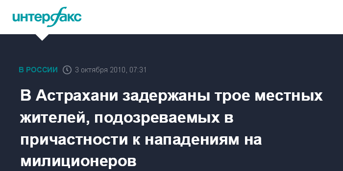 Ростов-на-Дону. 3 октября. ИНТЕРФАКС-ЮГ - Трое подозреваемых в вооруженных нападениях на сотрудников милиции задержаны в Астрахани, у одного из задержанных изъято самодельное взрывное устройство, сообщили агентству "Интерфакс-Юг" в правоохранительных органах области.