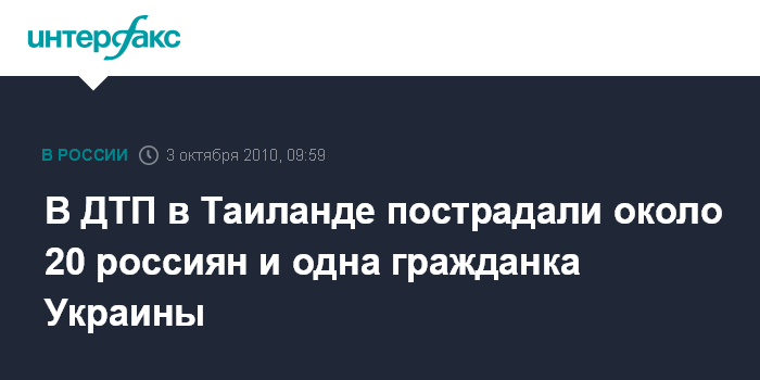 Бангкок. 3 октября. INTERFAX.RU - В ДТП с туристическим автобусов, которое произошло недалеко от курортного города Паттайя в Таиланде, пострадали около 20 россиян и одна гражданка Украины, сообщил "Интерфаксу" в воскресенье заведующий консульским отделом посольства России в Таиланде Андрей Дворников.