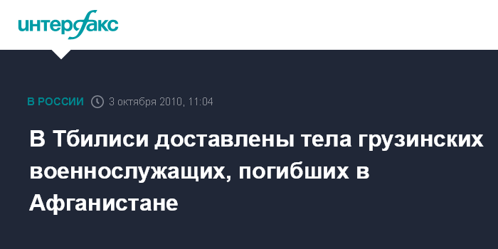 Тбилиси. 3 октября. INTERFAX.RU - Гробы с телами погибших 30 сентября в Афганистане четырех грузинских военнослужащих - полковника Рамаза Гогиашвили, сержанта Давида Цецхладзе и капралов Гиоргия Колхиташвили и Нугзара Каландадзе в ночь на воскресенье спецавиарейсом были доставлены из Кабула в Тбилиси, сообщили "Интерфаксу" в Минобороны Грузии. Самолет в тбилисском аэропорту встречал военный караул, министр обороны Бачао Ахалая, родственники погибших.
