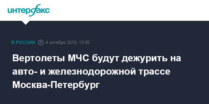 Москва. 4 октября. INTERFAX.RU - Вертолеты МЧС встанут на постоянное дежурство на трассе Москва - Санкт-Петербург, сообщил глава МЧС Сергей Шойгу.