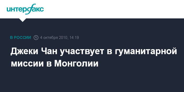 Улан-Батор. 4 октября. ИНТЕРФАКС - Голливудский актер, режиссер и продюсер Джеки Чан осуществляет гуманитарную миссию в Улан-Баторе, сообщает в понедельник телеканал "АИСТ-Монголиа".