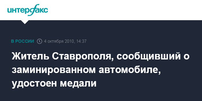"На еженедельной планерке в понедельник Гаевский сообщил, что житель Ставрополя, бдительность которого на прошлой неделе помогла предотвратить крупный теракт в краевом центре, будет отмечен высокой наградой региона - медалью "За заслуги перед Ставропольским краем", - сообщили агентству "Интерфакс" в пресс-службе главы региона.
