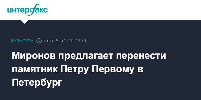 Москва. 4 октября. INTERFAX.RU - Спикер Совета Федерации Сергей Миронов допускает возможность переноса памятника Петру Первому работы Зураба Церетели из Москвы в Санкт-Петербург.