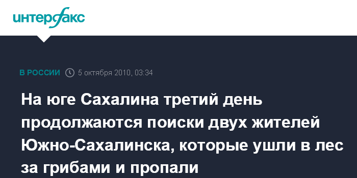 Южно-Сахалинск. 5 октября. ИНТЕРФАКС-ДАЛЬНИЙ ВОСТОК - Сахалинские спасатели продолжают поиск двух жителей Южно-Сахалинска, которые в воскресенье пропали в лесу в Корсаковском районе, сообщили агентству "Интерфакс - Дальний Восток" в пресс-службе ГУ МЧС по Сахалинской области.