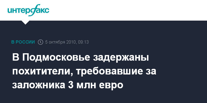 Москва. 5 октября. INTERFAX.RU - В Подмосковье из плена освобожден предприниматель, похитители которого требовали выкуп в 3 млн евро, сообщил "Интерфаксу" источник в правоохранительных органах.