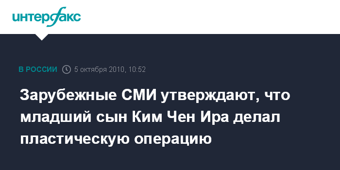 Лондон. 5 октября. INTERFAX.RU - Южнокорейские СМИ полагают, что младший сын северокорейского лидера Ким Чен Ира - Ким Чен Ун - воспользовался помощью пластических хирургов, чтобы стать более похожим на своего деда - Ким Ир Сена, пишет во вторник британская газета Daily Telegraph.