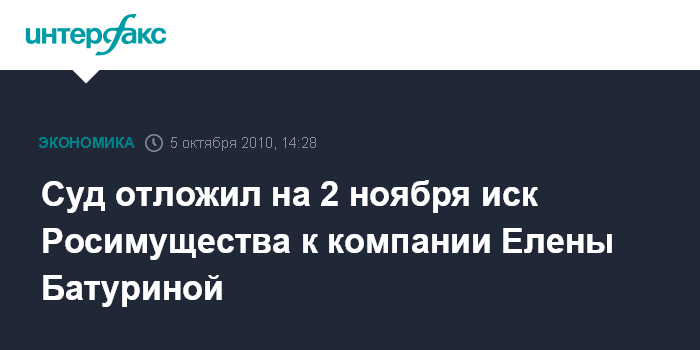 Москва. 5 октября. INTERFAX.RU - Арбитражный суд Москвы во вторник отложил на 2 ноября предварительное заседание по рассмотрению иска Федерального агентства по управлению государственным имуществом (Росимущество) к ЗАО "Территориальная дирекция "Сетуньская", акционером которого является Елена Батурина