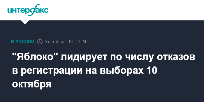 Пушкин. 5 октября. INTERFAX.RU - Партия "Яблоко" лидирует по числу отказов в регистрации кандидатов на выборах в единый день голосования 10 октября, сообщила глава Центрально избирательной комиссии РФ Владимир Чуров.
