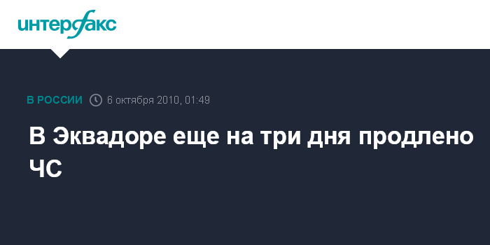 Лондон. 6 октября. ИНТЕРФАКС - Президент Эквадора Рафаэль Корреа продлил до 8 октября срок действия чрезвычайного положения на территории этой латиноамериканской страны, сообщает британская телерадиовещательная корпорация Би-би-си.