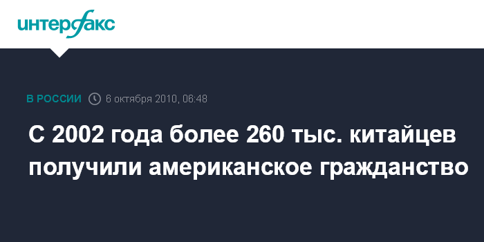 Пекин. 6 октября. ИНТЕРФАКС-КИТАЙ - Более 260 тыс. китайцев старше 18 лет получили американское гражданство с 2002 по 2009 год, сообщает в среду китайское информационное агентство "Чжунго синьвэнь" со ссылкой на официальные данные американской статистики.