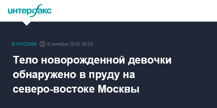 Москва. 6 октября. INTERFAX.RU - На Северо-востоке Москвы в пруду обнаружено тело новорожденной девочки, сообщил "Интерфаксу" источник в правоохранительных органах.