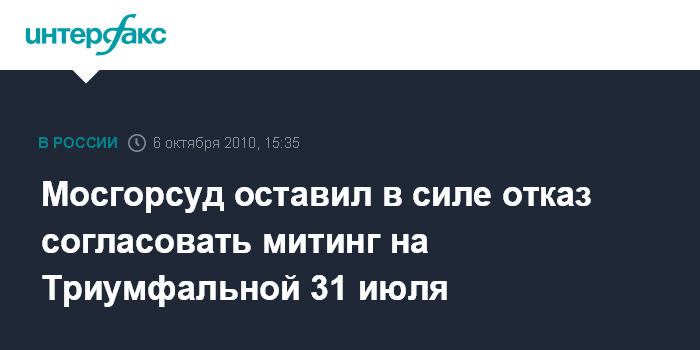 Москва. 6 октября. INTERFAX.RU - Организаторам акции в защиту конституционной свободы собраний на Триумфальной площади в Москве не удалось добиться отмены решения о законности отказа столичных властей согласовать мероприятие 31 июля.