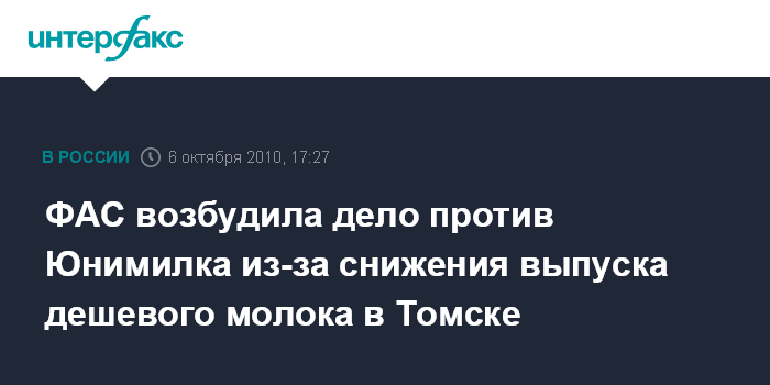 В сообщении отмечается, что "Юнимилк" занимает доминирующее положение на рынке Томской области, а также является крупнейшим в области производителем молочной продукции. В то же время п. 4 ч. 1 ст. 10 закона "О защите конкуренции" запрещает действия доминирующего хозяйствующего субъекта, которые без экономического или технологического обоснования приводят к прекращению производства товара, если на этот товар имеется спрос. Комиссия томского УФАС рассмотрит обстоятельства дела против "Юнимилка" 29 октября.