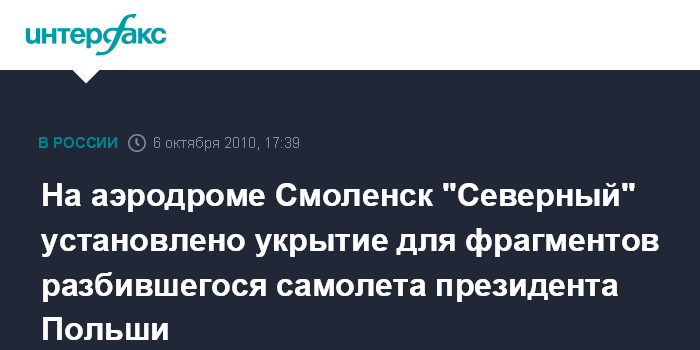Москва. 6 октября. INTERFAX.RU - Российские специалисты установили укрытие на аэродроме Смоленск "Северный" на площадке, где выложены сохранившиеся фрагменты самолета Ту-154 президента Польши Леха Качиньского, сообщили "Интерфаксу" в Межгосударственном авиационном комитете.