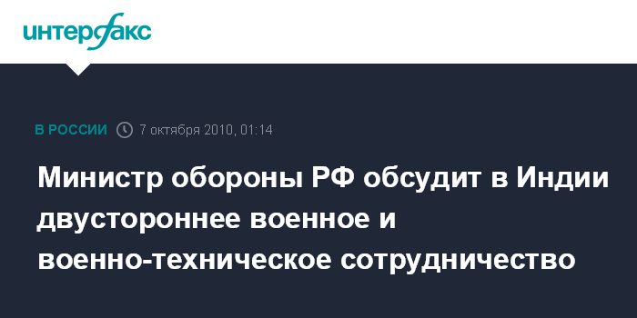 "Глава российского оборонного ведомства в период с 6 по 7 октября посетит с визитом Индию, где в четверг примет участие в 10-м заседании Российско-индийской межправительственной комиссии по военно-техническому сотрудничеству", - сообщила пресс-секретарь министра обороны РФ подполковник Ирина Ковальчук.