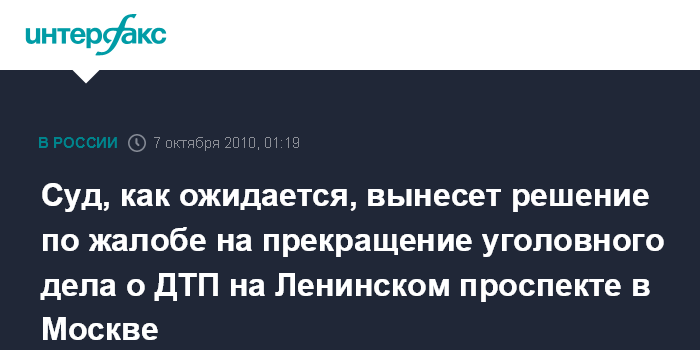 Суд, как ожидается, вынесет решение по жалобе на прекращение уголовного дела о ДТП на Ленинском проспекте в Москве