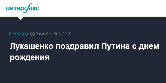 Минск. 7 октября. INTERFAX.RU - Президент Белоруссии Александр Лукашенко поздравил председателя правительства Российской Федерации Владимира Путина с днем рождения, сообщили агентству "Интерфакс" в четверг в пресс-службе главы белорусского государства.