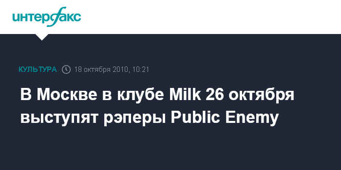 Москва. 18 октября. INTERFAX.RU – Нью-йоркские рэперы Public Enemy приезжают в Москву с концертом. Он состоится 26 октября на сцене клуба Milk.