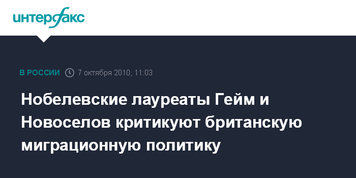 Лондон. 7 октября. INTERFAX.RU - Группа лауреатов Нобелевской премии, среди которых - работающие в Великобритании выходцы из России Андрей Гейм и Константин Новоселов, призвали британские власти внести изменения в миграционную политику, сообщают в четверг местные СМИ.