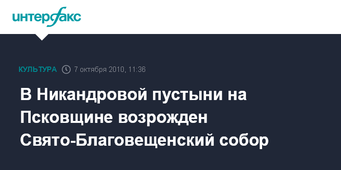 Псков. 7 октября. INTERFAX.RU - В Никандровой пустыни (Порховский район Псковской области) состоится освящение возрожденного Свято-Благовещенского собора, сообщили "Интерфаксу" в информационной службе Псковской епархии.