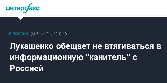 Минск. 7 октября. ИНТЕРФАКС-ЗАПАД - Президент Белоруссии Александр Лукашенко заявил, что не собирается ввязываться в информационный конфликт с российским руководством, сообщили агентству "Интерфакс" в четверг в пресс-службе главы государства.