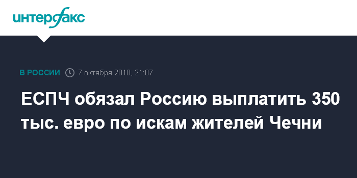 Страсбург. 7 октября. INTERFAX.RU - Европейский суд по правам человека постановил, что Россия должна выплатить около 350 тыс. евро по искам родственников двух уроженцев Чечни Хамзата Мержоева и Али Гастамирова, пропавших без вести, а также пенсионера из Чечни Алаудина Садыкова, подвергшегося пыткам в 2000 г., говорится в пресс-релизе суда, распространенном в четверг.
