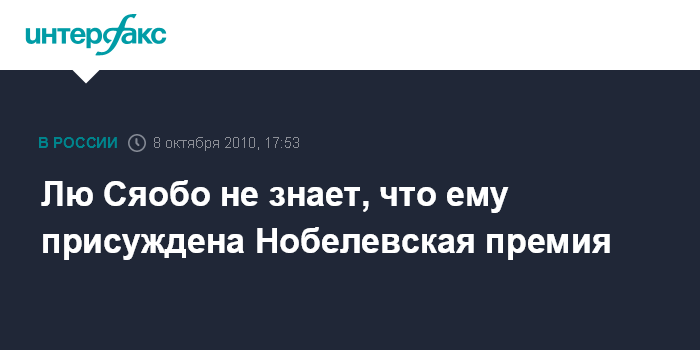 Пекин. 8 октября. INTERFAX.RU - Китайский диссидент Лю Сяобо не знает о том, что стал лауреатом Нобелевской премии мира 2010 года, так как в настоящее время он находится в тюрьме и не имеет связи с внешним миром, сообщили в пятницу в интервью агентству ЭФЭ адвокаты заключенного Мо Шаопин и Пу Чжицян.