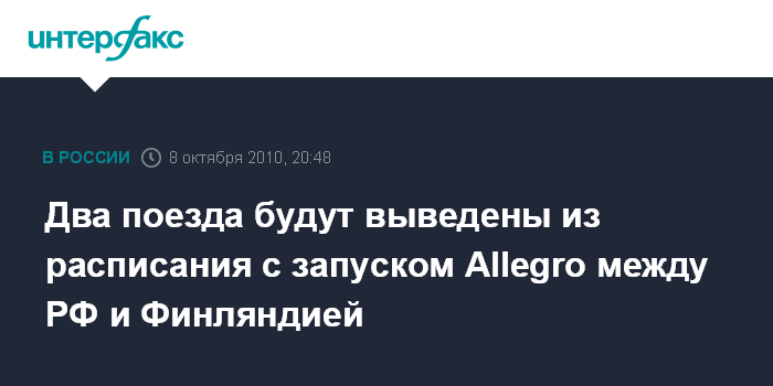 Москва. 8 октября. INTERFAX.RU - Два поезда будут выведены из расписания с запуском между Санкт-Петербургом и Хельсинки в декабре скоростных электропоездов Allegro, говорится в сообщении ОАО "Российские железные дороги" (РЖД).
