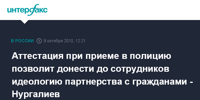 Москва. 9 октября. INTERFAX.RU - Переаттестация сотрудников правоохранительных органов при переходе от милиции к полиции поможет мотивировать личный состав к партнерству во взаимоотношениях с населением, рассчитывает глава МВД РФ Рашид Нургалиев. "Такая мера (переаттестация) вызвана, в первую очередь, новыми требованиями к личному составу, сформулированными в ходе реформы МВД и в рамках подготовки закона "О полиции", - объяснил Р.Нургалиев на церемонии принятия присяги курсантами Университета МВД России.