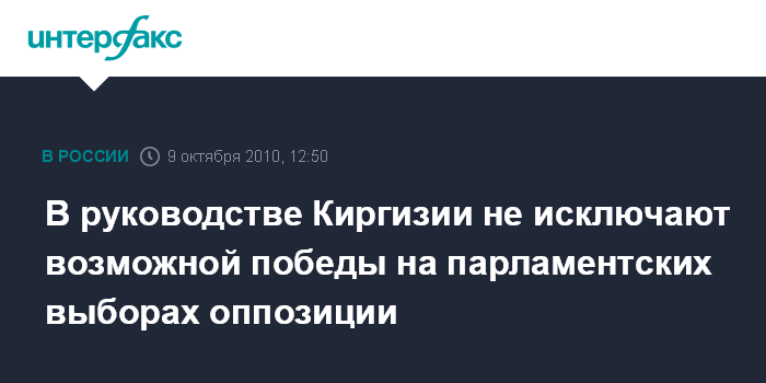 Бишкек. 9 октября. INTERFAX.RU - В руководстве Киргизии не исключают возможной победы на парламентских выборах 10 октября оппозиционных партий, но заявляют, что население поддерживает действующие власти. "В условиях демократичных выборов возможен любой исход и могут победить партии, которые не принимают итоги 7 апреля (привели к смене власти в Киргизии - ИФ) и конституционного референдума", - заявил "Интерфаксу" руководитель администрации президента Киргизии Эмиль Каптагаев.